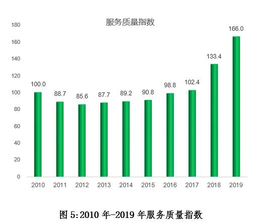 2019年,快遞服務質量指數(shù)為166.0,同比提高24.4%。