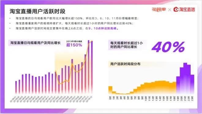《報告》顯示,淘寶直播的日均觀看用戶數同比大幅增長超150%,環(huán)比在3、6、10、11月份增幅最明顯;淘寶直播重度用戶的規(guī)模持續(xù)擴大,每天觀看時長超過1小時的用戶同比增長達到40%。