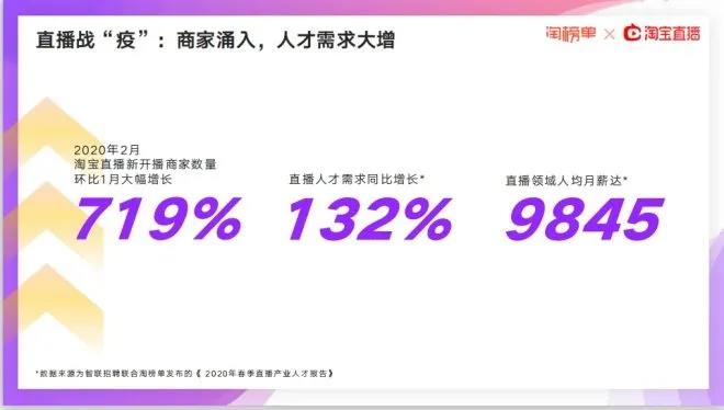 智聯招聘聯合淘榜單發(fā)布的《2020年春季直播產業(yè)人才報告》顯示,2020年2月淘寶直播新開播商家數量環(huán)比1月大幅增長,達到719%;直播人才需求同比增長132%,直播領域人均月薪達9845元。