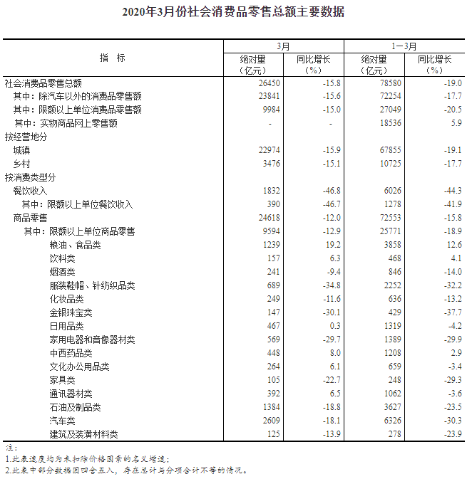 消費(fèi)方面,3月份,社會(huì)消費(fèi)品零售總額26450億元,同比下降15.8%(扣除價(jià)格因素實(shí)際下降18.1%,以下除特殊說明外均為名義增長(zhǎng)),降幅比1-2月份收窄4.7個(gè)百分點(diǎn)。其中,除汽車以外的消費(fèi)品零售額23841億元,下降15.6%。